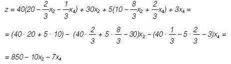 kde veličina F = 430 je hodnota účelové funkce pro bazické řešení x 1 a ∆1 = –21 a ∆2 = –4 jsou tzv. redukované ceny.