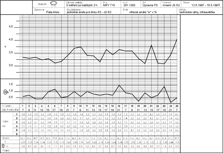 regulace procesu pomocí formuláře, do něhož jsou předkresleny čáry středních hodnot a regulačních mezí. Operátor provádí záznamy