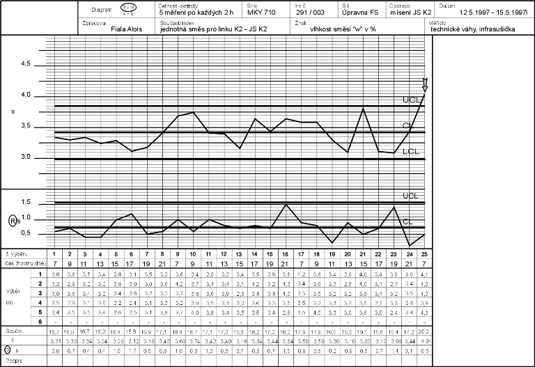Stejnému testování se podrobí i část diagramu pro výběrový průměr ¯x. Ze všech osmi testů je v demonstračním příkladu sedm negativních; první test - jeden bod leží mimo regulační meze. Proto je nutno konstatovat, že proces není statisticky zvládnutý.